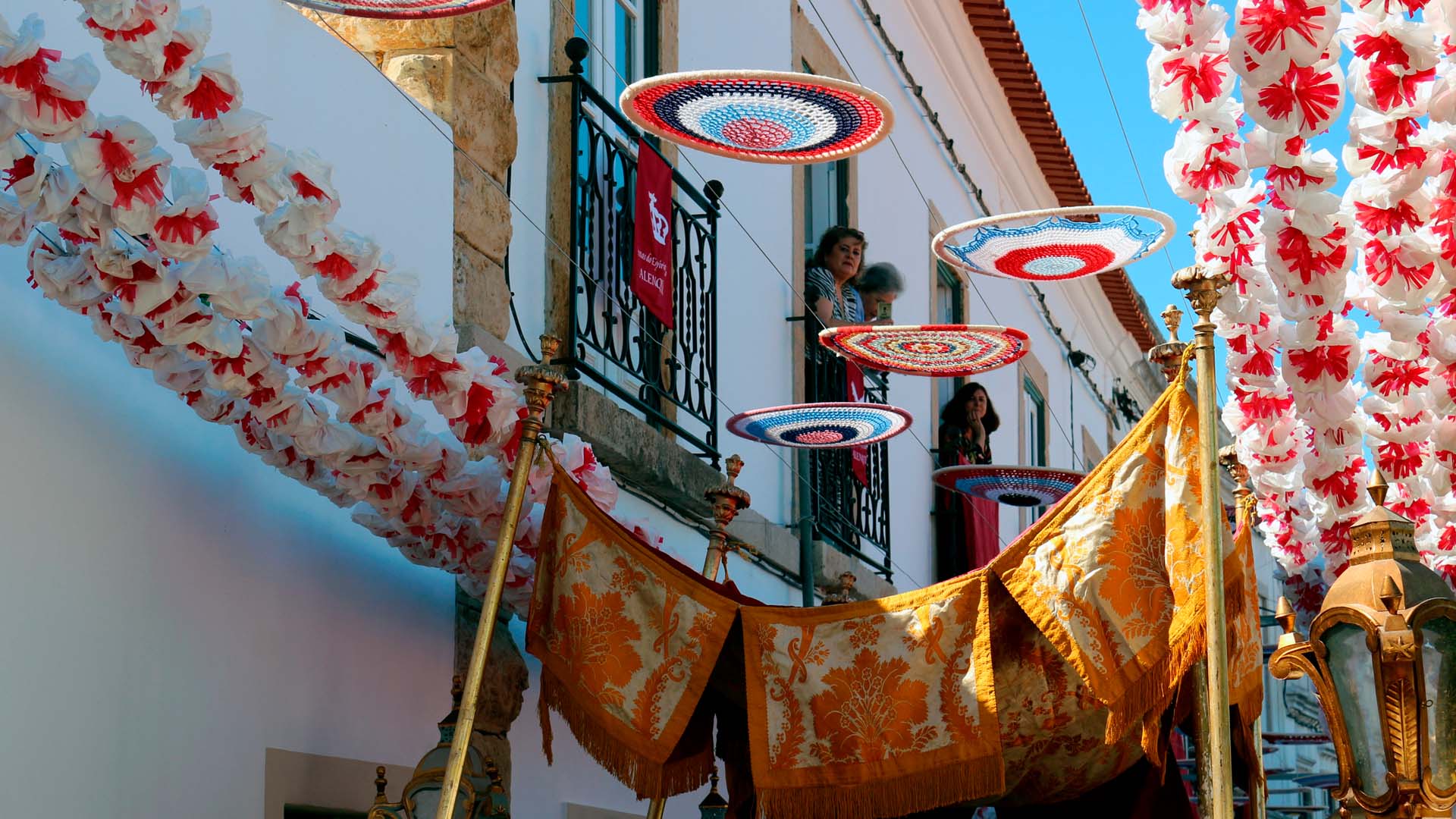 No fim de semana de Pentecostes, as ruas da vila que recebem as festas de encerramento das FIDES estão decoradas com arcos e frontões de flores.