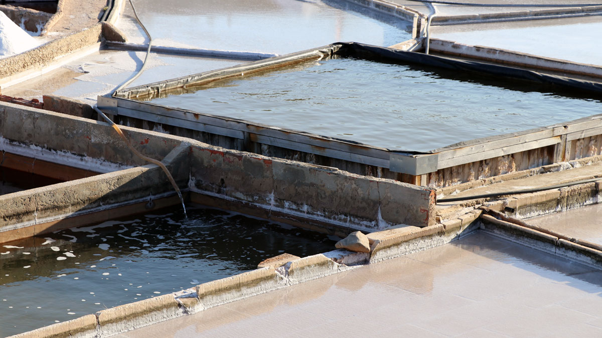 Atualmente esta fase está muito simplificada porque, por um lado, a maioria dos talhos está integrada na cooperativa, o que facilita o processo de gestão da água e do sal, mas também porque a água é agora retirada do poço por bombas elétricas que a bombeiam para os oito tanques concentradores localizados na parte alta das salinas, com capacidade para cerca de 1 milhão de litros de água. Aqui, a água vai sendo depurada e evaporada à medida que passa de tanque em tanque,[2] aumentando o seu grau de salinidade[3] e daí é que desce, por gravidade, até aos talhos, através de mangueiras que percorrem toda a salina. Antigamente, a água salgada era encaminhada por regueiras, passando pelos babeiros (sítios por onde a água corria da regueira) para os diferentes esgoteiros e talhos.