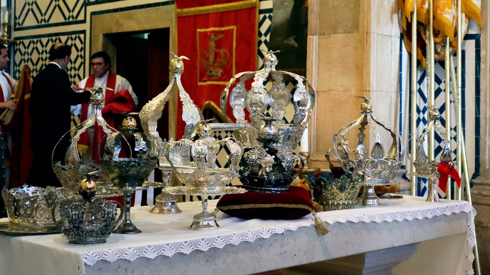 Coroas das diferentes comunidades expostas no Encerramento das FIDES, Capela do Espírito Santo, em Alenquer (2022).