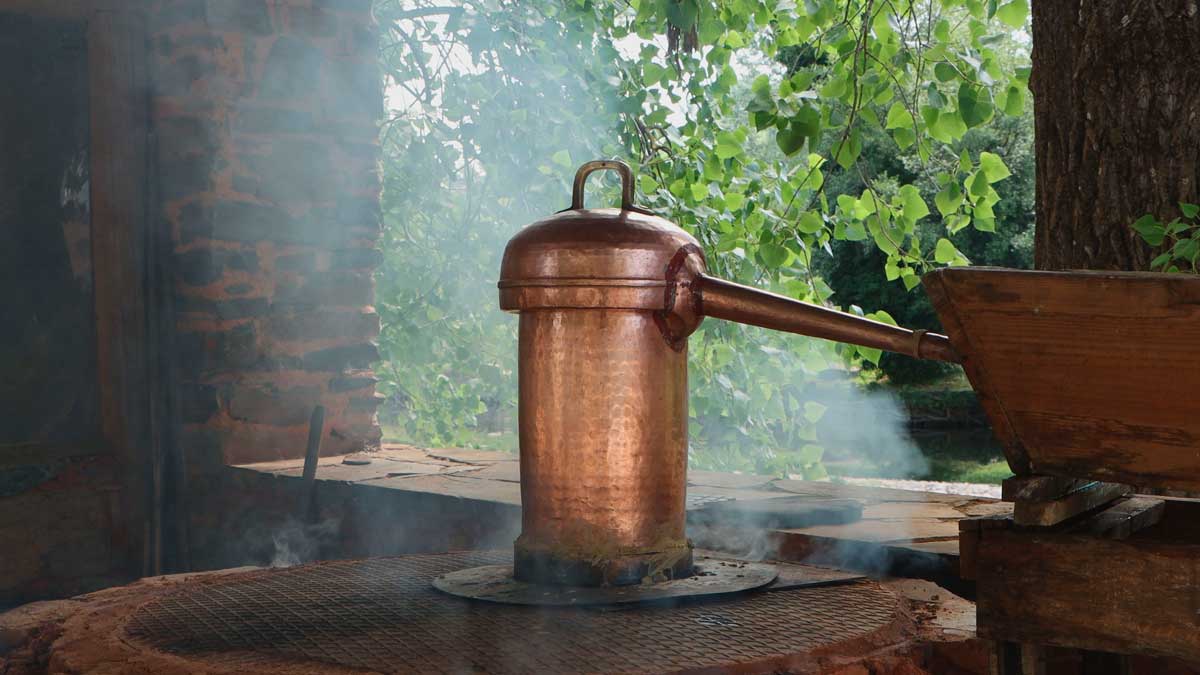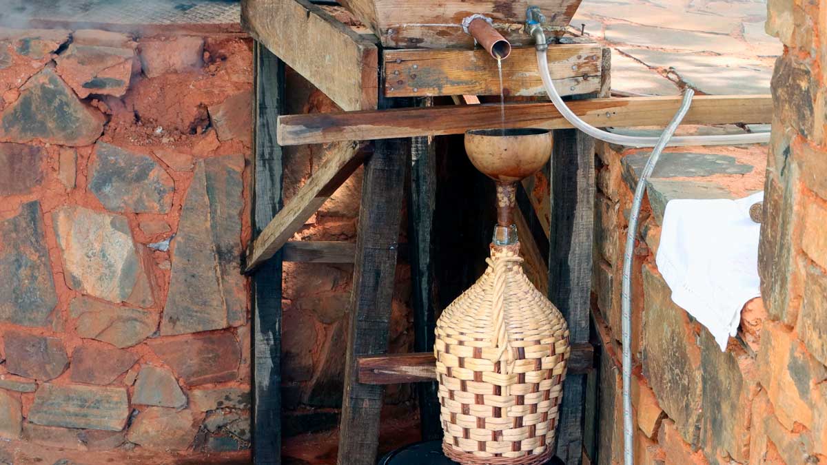 O alambique de cobre é um elemento crucial neste processo, onde se controla rigorosamente a temperatura e a quantidade de lenha utilizada para garantir uma destilação eficiente e de alta qualidade.