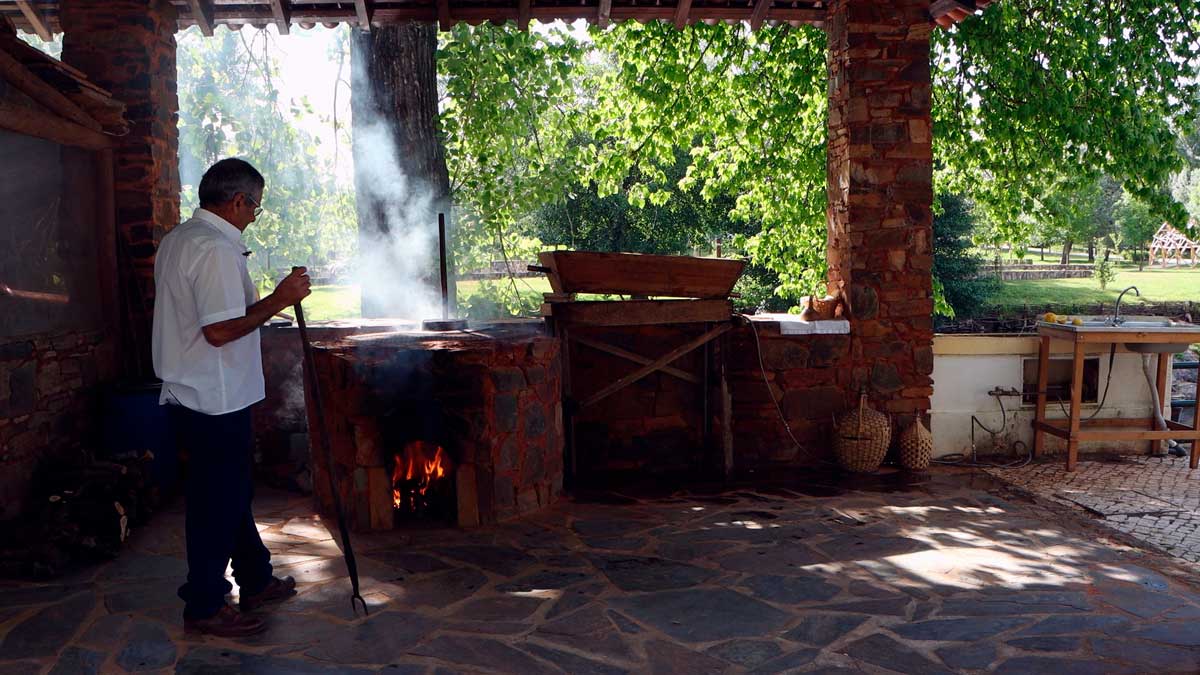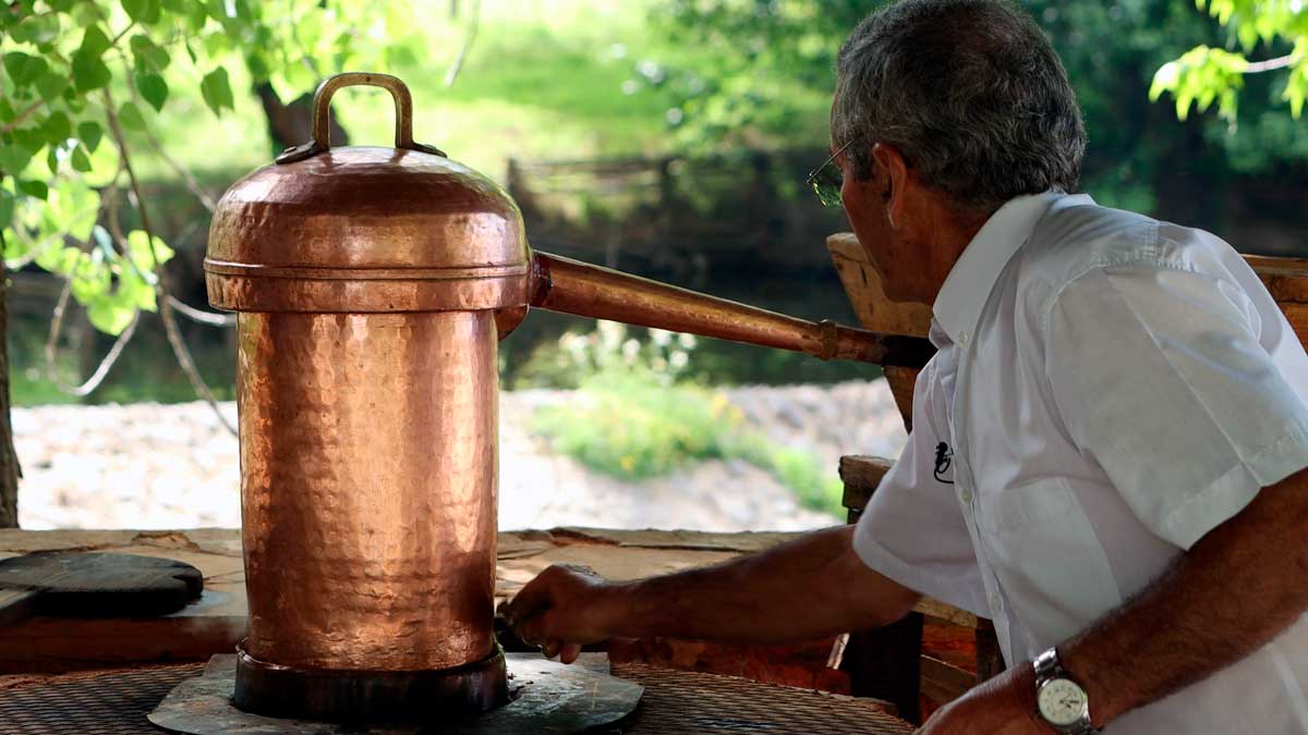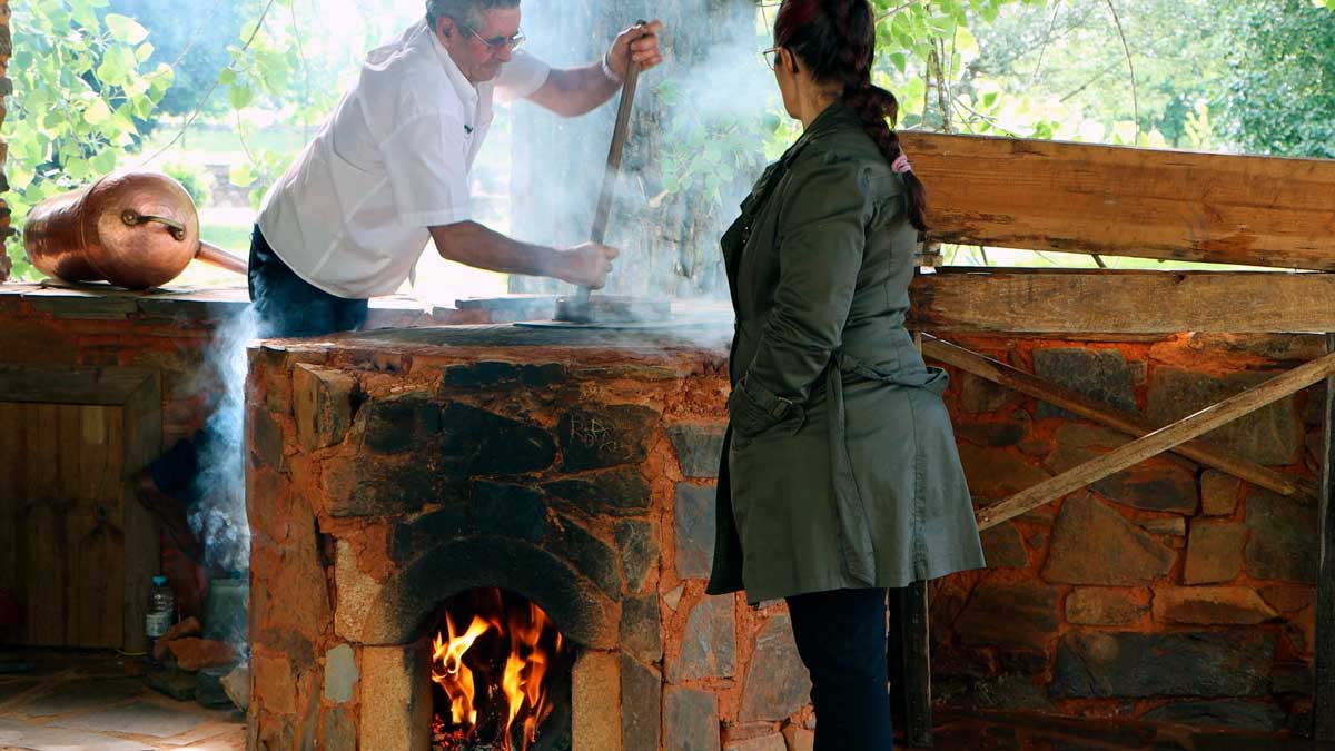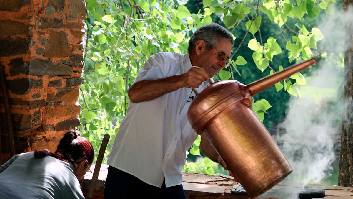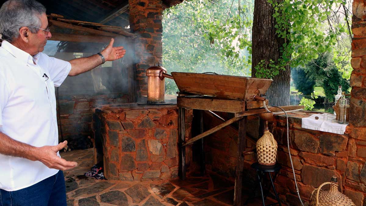 José Simão, um dos produtores locais, descreve detalhadamente as diferentes etapas do processo de produção da aguardente de medronho: