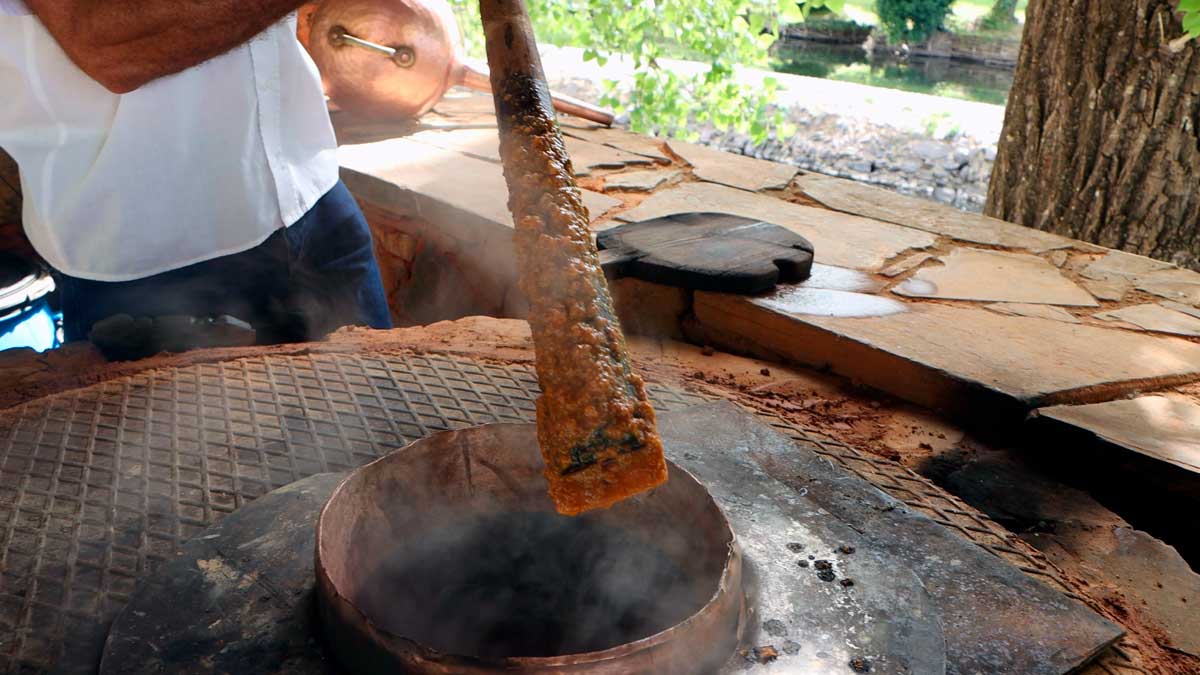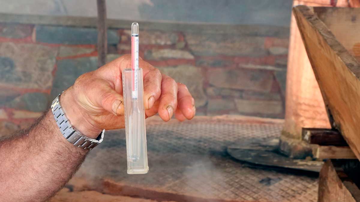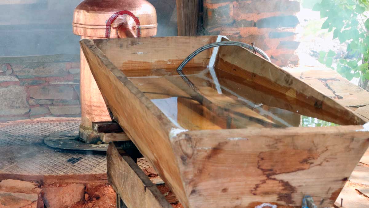 É no período de fermentação que o açúcar presente no fruto se transforma em álcool. Uma vez terminado este processo, o medronho fermentado é transferido para o alambique, o equipamento utilizado para a destilação. João Pires explica que antes de iniciar a destilação, o alambique é cuidadosamente lavado com água e sumo de limão, que ajuda a limpar o cobre e a garantir que o equipamento está em ótimas condições de higiene.