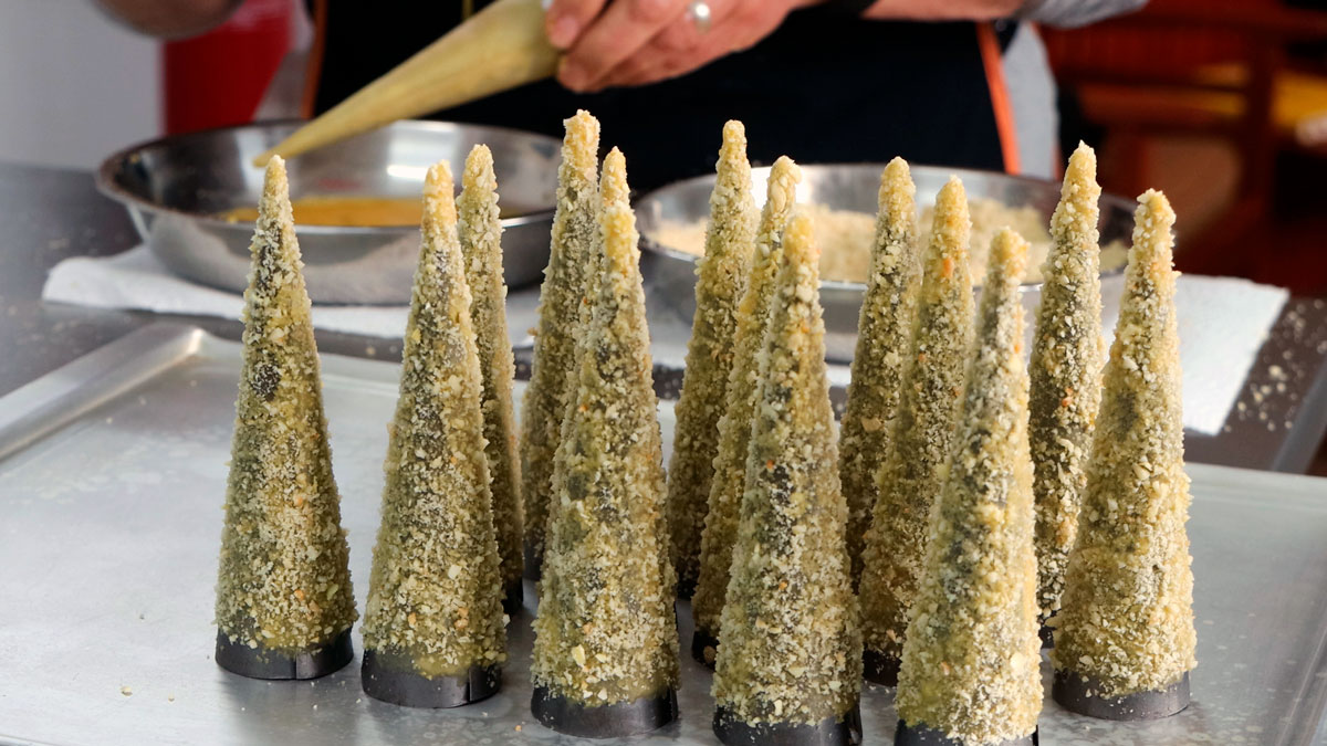 A massa é esticada e cortada em triângulos, que são colocados em formas cónicas de metal previamente untadas com manteiga. Com as mãos, molda-se a massa para dar o formato característico com bico. Segundo Silvina, o bico é uma marca da sua produção — “os meus são conhecidos até pelo bico”, ao contrário dos formatos redondos de outras doceiras.